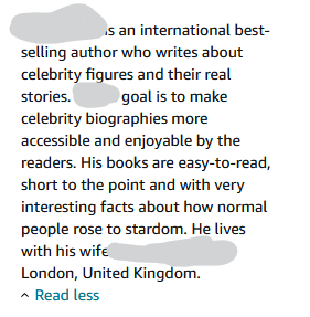 A quick perusal of Kindle Exclusive author bios show a full gamut. Take this one, where the writer seems to have almost nothing to say about himself. In just four short sentences of vague descriptors, I learn very little about who this person is–and, since he writes biographies, I’m not much motivated to hear what he has to say about others’ lives. I would suggest to this writer that he give himself a bit more time to make some mess: I don’t see many promising ingredients to work with yet.