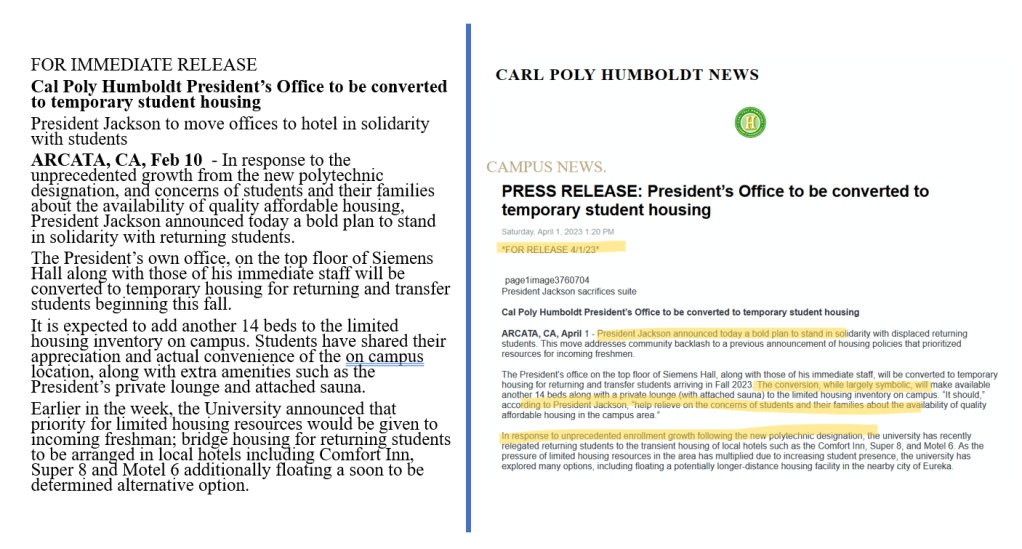 On the left is the original email I received from an account administrator. On the right, my edits that eventually released to the public. I didn’t change much of the essence, but I -did- do a quick refresher course on press release conventions and adapt the original text to better suit a reader expecting to see one. In this first section, you can see a slight concision-ing, a reordering of clauses to mimic the steadier rhythm of journalistic writing, and a careful check for the passive voice we’ve all come to love in our news media–while shifting the lede to highlight the agent in our story.