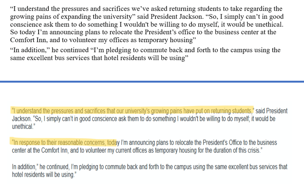 In this second portion, I’ve broken the fabricated quotes into smaller pieces that might offer quick soundbytes for the news, and I’ve removed some of that passive-voicing since we’re now attributing the language to an actual speaker. Honestly, though, after a quick look through some of the president’s past statements: both of these tones aren’t far off. University presidents, it seems, are subject to some of the same speech conventions as reporters? Or maybe he’s just equally wary of becoming an accountable agent?